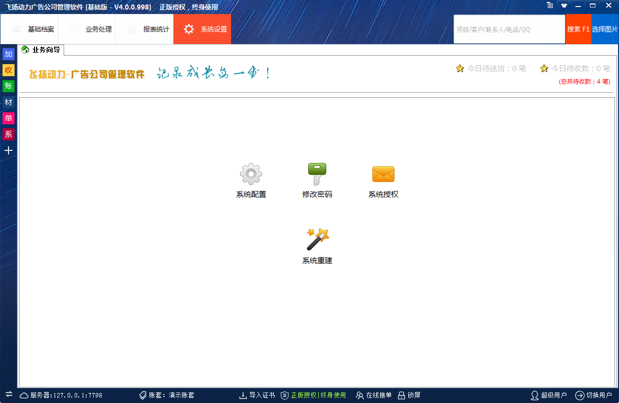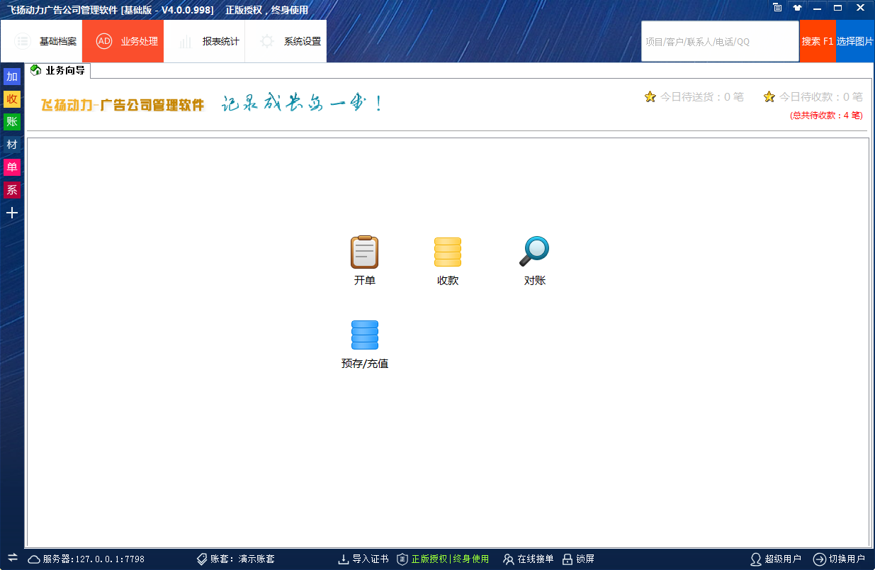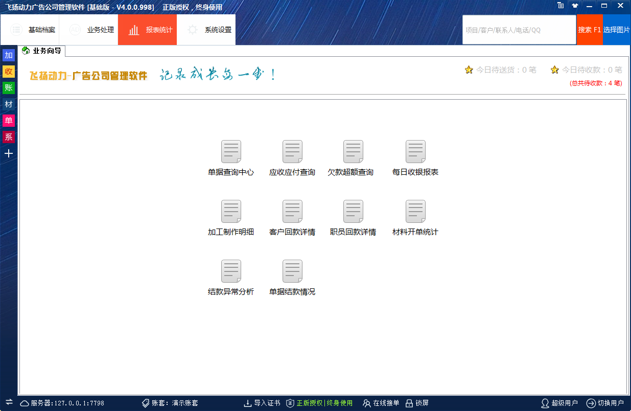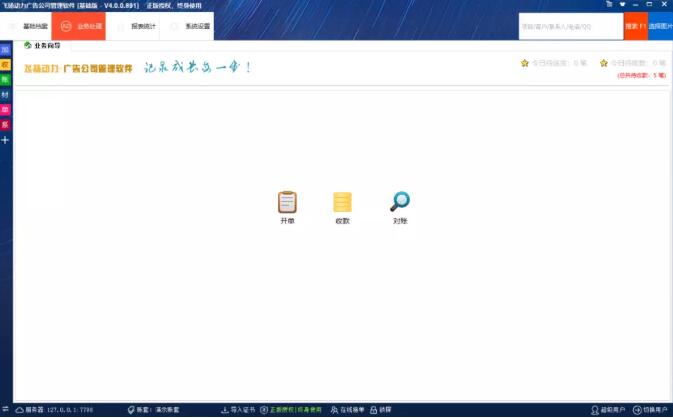 飛揚動力廣告公司管理軟件基礎版適合小型廣告門店使用,具備業(yè)務開單、客戶管理、材料管理、報表統(tǒng)計、業(yè)務單打印等功能模塊,能有效幫助企業(yè)解決生產銷售過程中各種管理難題。
