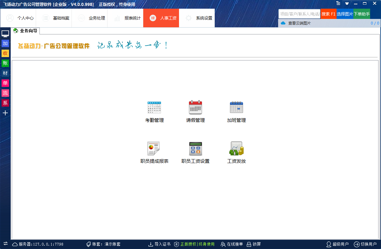 飛揚動力廣告公司管理軟件企業版集業務開單、外協加工管理、人事工資管理、業務流程管理、客戶管理、材料管理、往來策略(不同的客戶不同的價格)、業務單打印等多種管理功能為一體,適合中大型、連鎖型、集團型廣告制作企業。軟件通過將現代化企業管理理念同先進技術架構相結合,打造一體化數字管理體系,幫助廣告企業提升工作效率,實現數字化運營,讓企業管理更加高效、便捷。軟件能規范業務訂單,減少錯單重噴降低材料消耗,提高生產效率,及時統計分析、財務盈虧狀況,是廣告制作公司提升核心競爭力的必備“武器”!